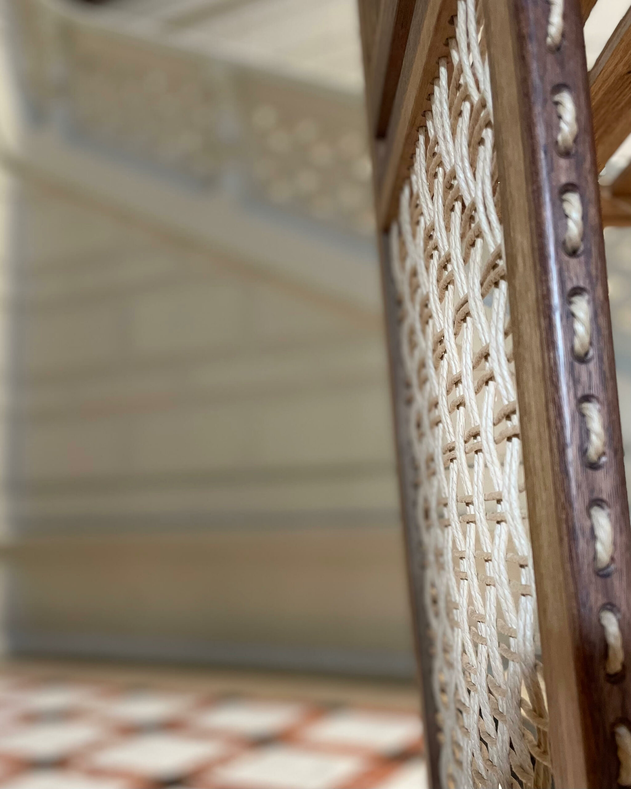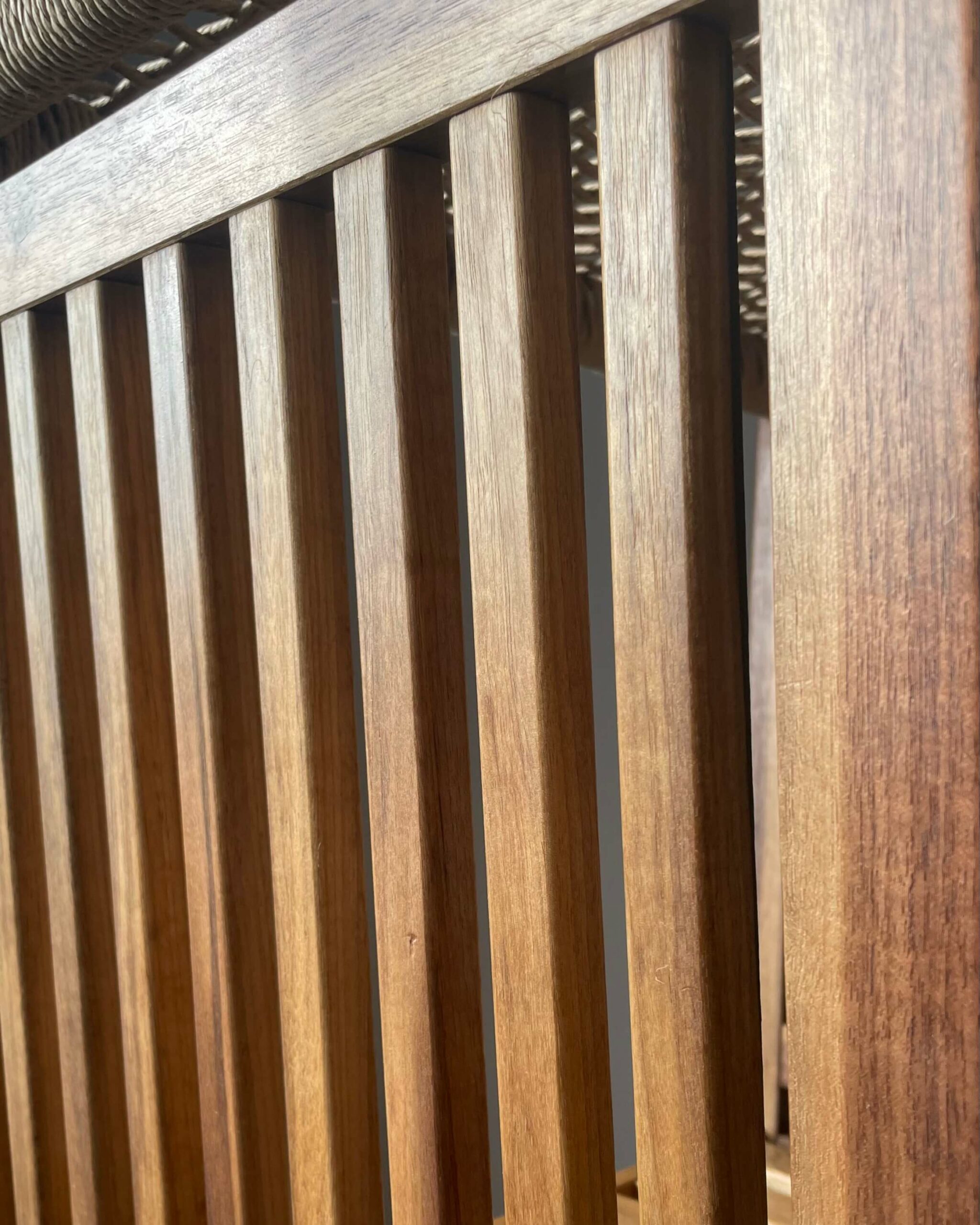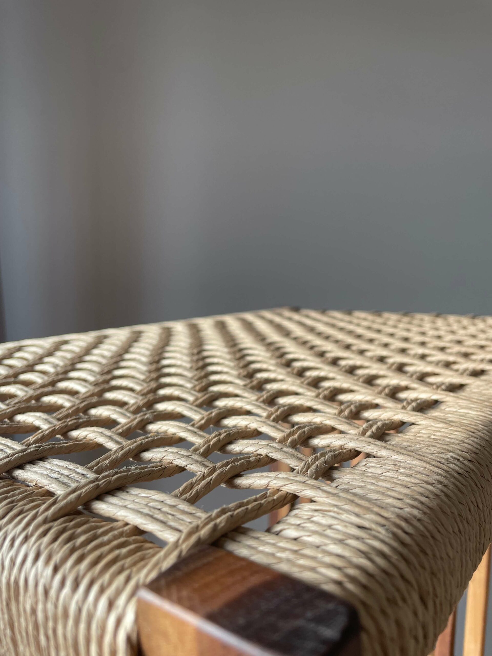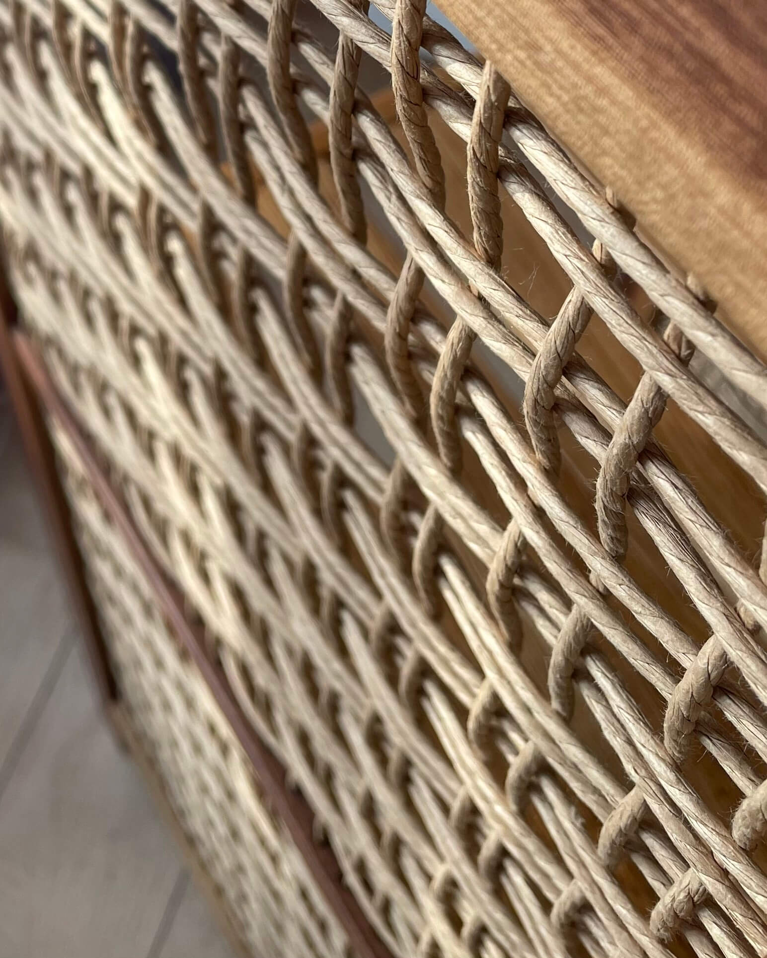 La corde danoise n’est pas ici un détail, elle devient surface et matière principale. Les côtés du meuble sont entièrement tissés, créant une enveloppe respirante pour laisser circuler la lumière. Résultat, les volumes restent légers malgré la hauteur.