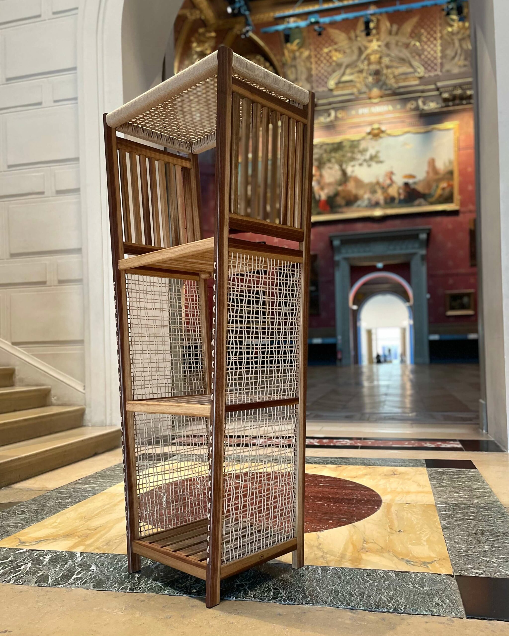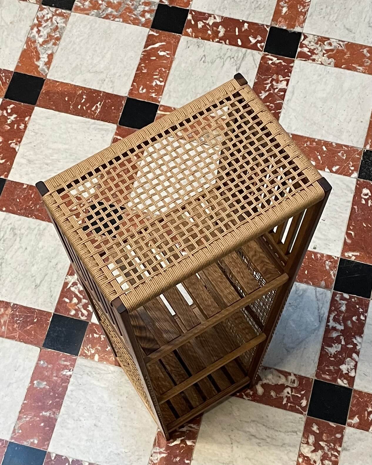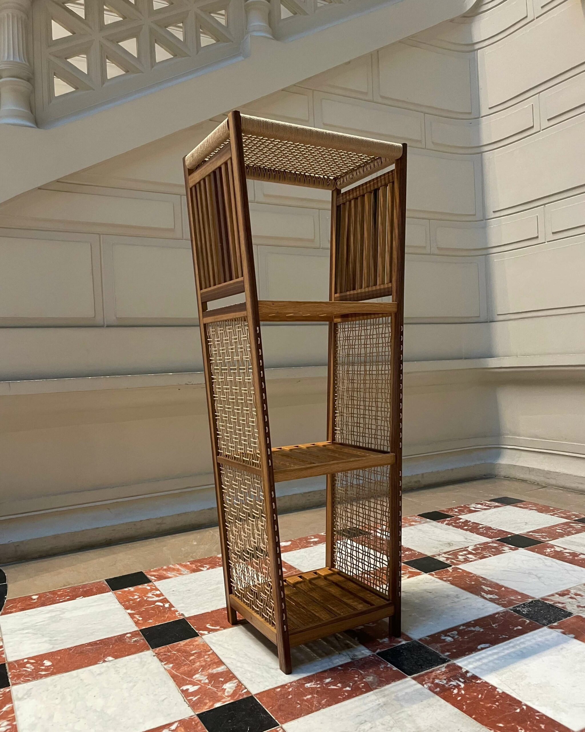 Une façade en trapèze, des côtés entièrement tissés et des plateaux qui deviennent des clayettes. Il ne s’agit plus seulement de contenir, il s’agit de structurer l’espace.