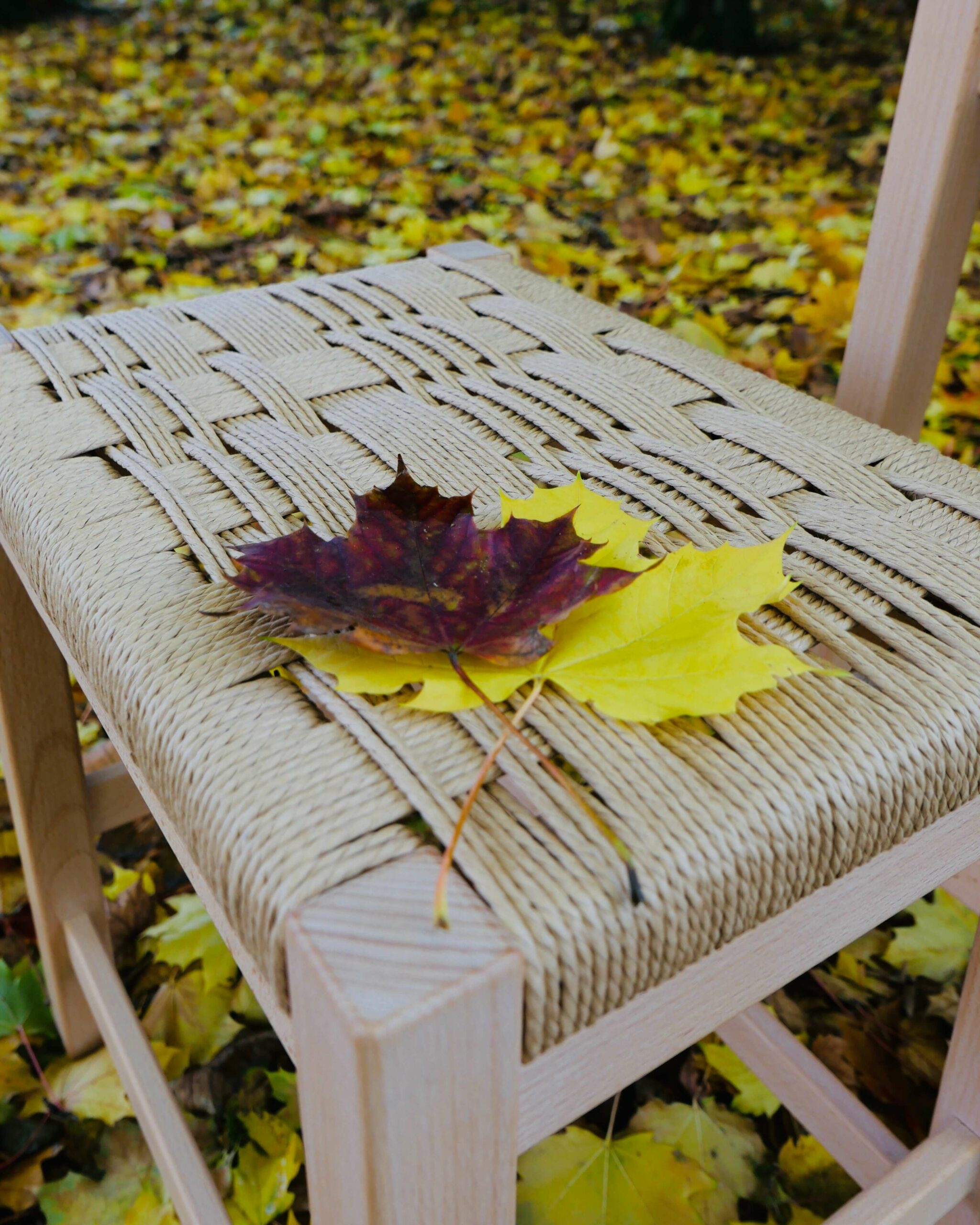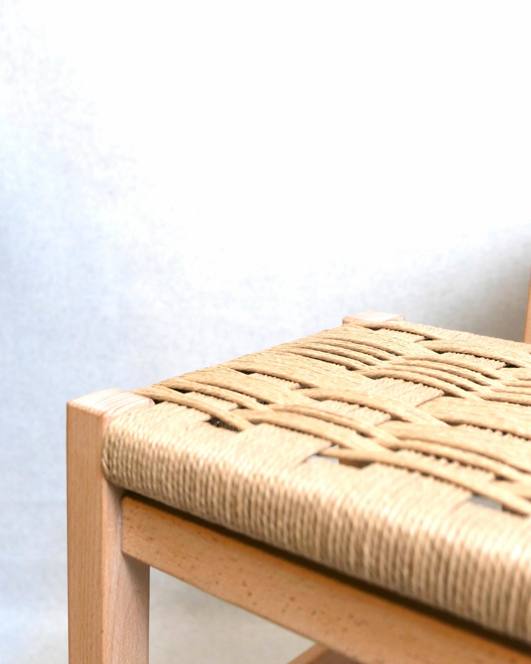 L’assise en corde danoise est un élément essentiel pour ces tabourets. Ici, le tressage ne cherche pas la répétition parfaite ni la stricte symétrie. Il s’autorise des variations, avec une lecture plus libre du motif.