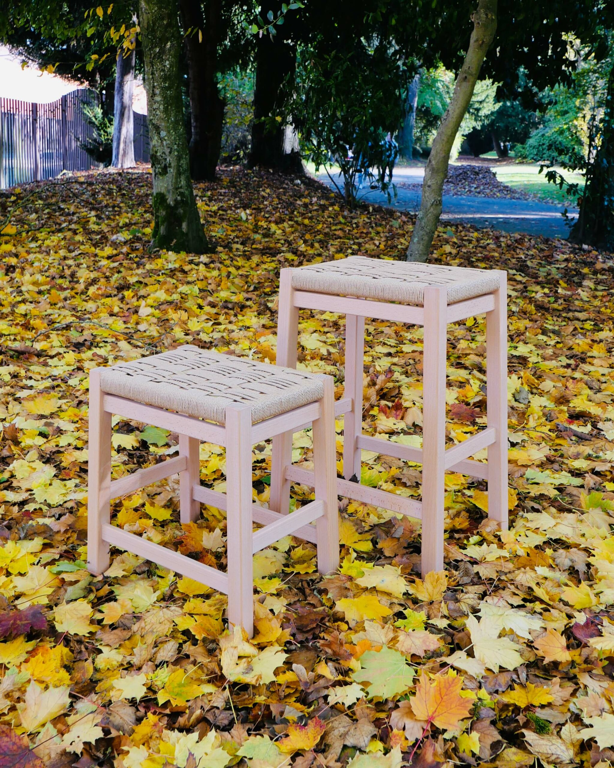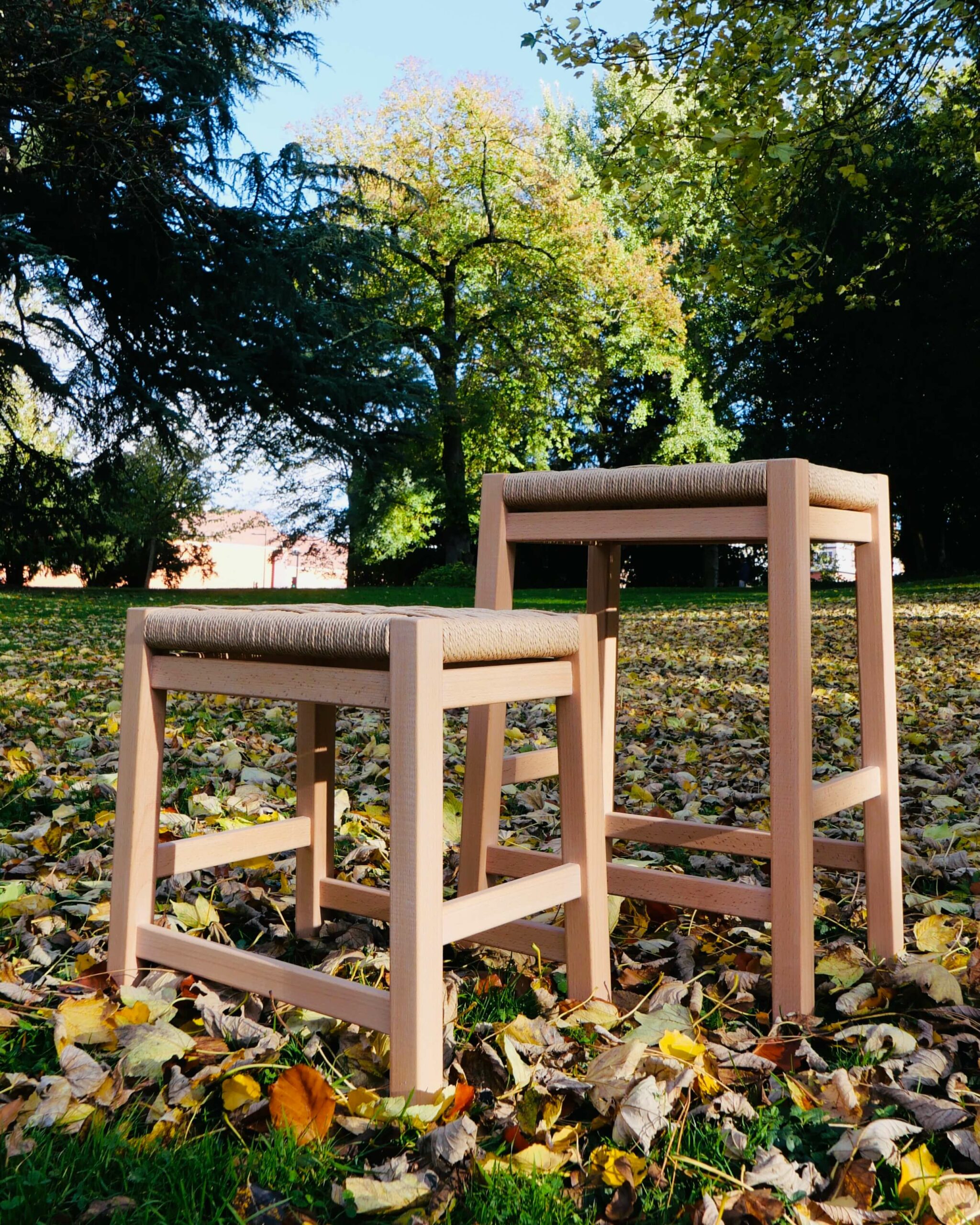 Réalisés en hêtre et corde danoise, ils interrogent la relation entre structure et tressage, entre régularité et variation. Une même base constructive, deux hauteurs, et un tissage volontairement déstructuré qui rompt avec les codes classiques du cordage danois.