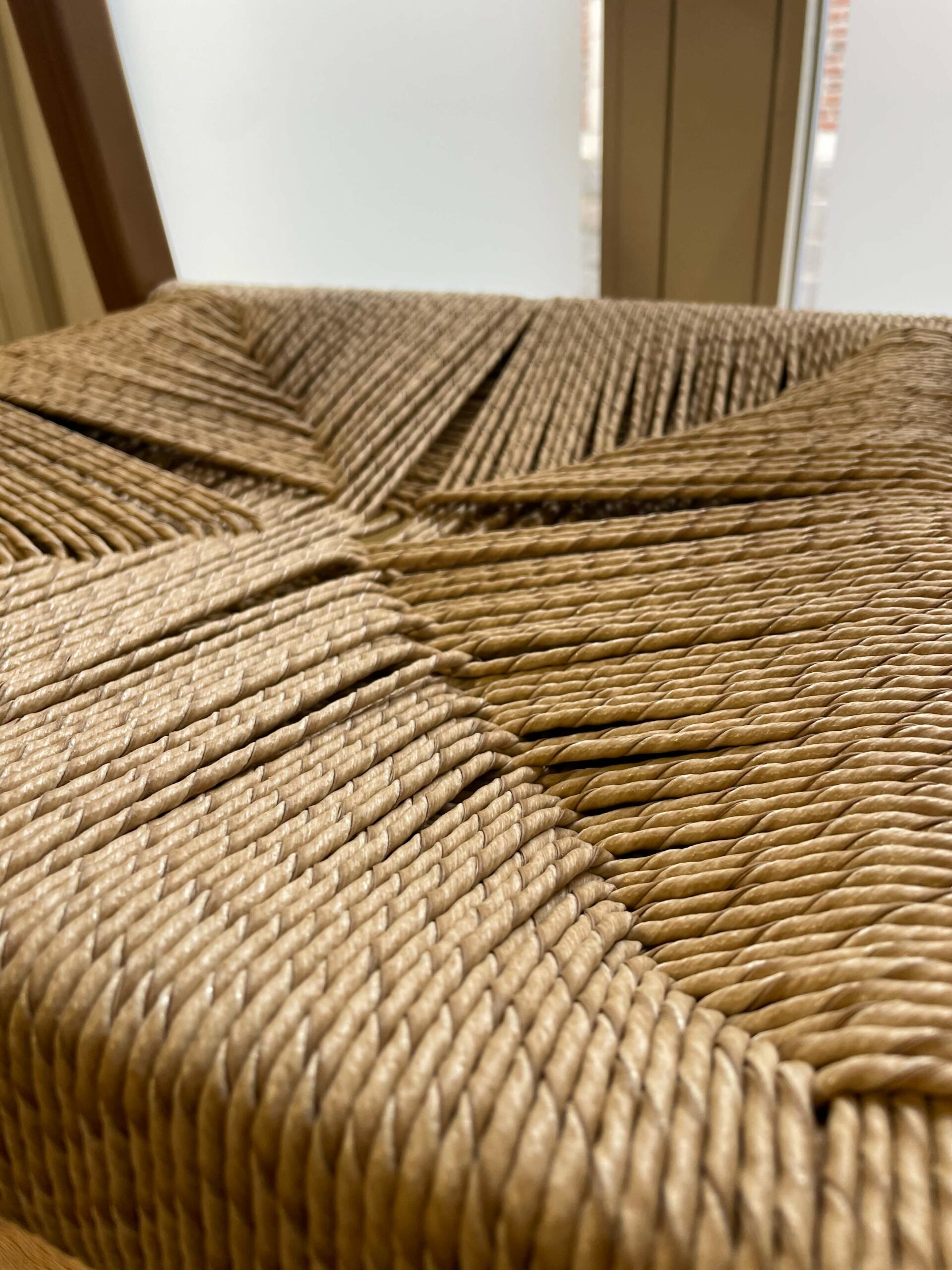 La corde danoise est composée de fibres de papier torsadées et cirées. Elle offre une résistance remarquable, un confort naturel par le tissage et une grande durabilité. Sur le palissandre, le contraste est saisissant : la clarté de la fibre révèle la profondeur du bois. Le motif choisi par les clients reste classique, structuré, fidèle aux designers danois des années 50 et 60. La sobriété met en valeur la matière.