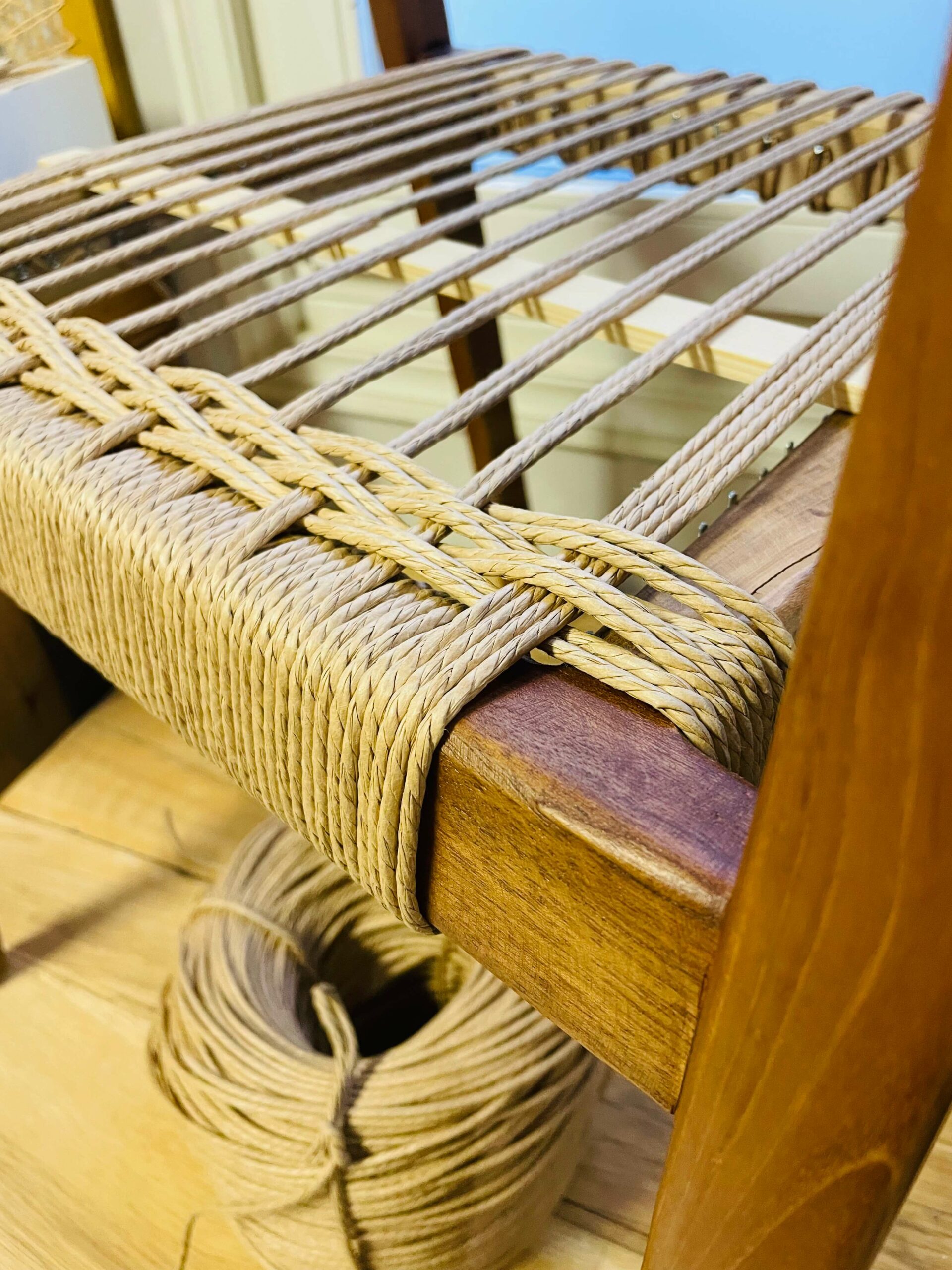 Chaque fauteuil a été entièrement repris : dépose des anciennes assises, retrait des kilomètres de corde. extraction des nombreuses agrafes dissimulées sous le tissage et mise à nu complète des cadres. Puis est venu le temps du tracé, indispensable pour garantir la régularité du tissage. Près d’une centaine de clous par chaise ont été posés un à un pour accueillir la corde danoise. Sur le tissage d’origine, une partie du bois était restée brute, il a donc fallu nettoyer, teinter, puis appliquer une huile de finition afin d’harmoniser l’ensemble. Le tissage en corde danoise n’est pas un simple habillage décoratif. Il s’agit d’un travail structurel qui exige : une gestion précise des tensions, une régularité géométrique et une stabilité dans le temps.