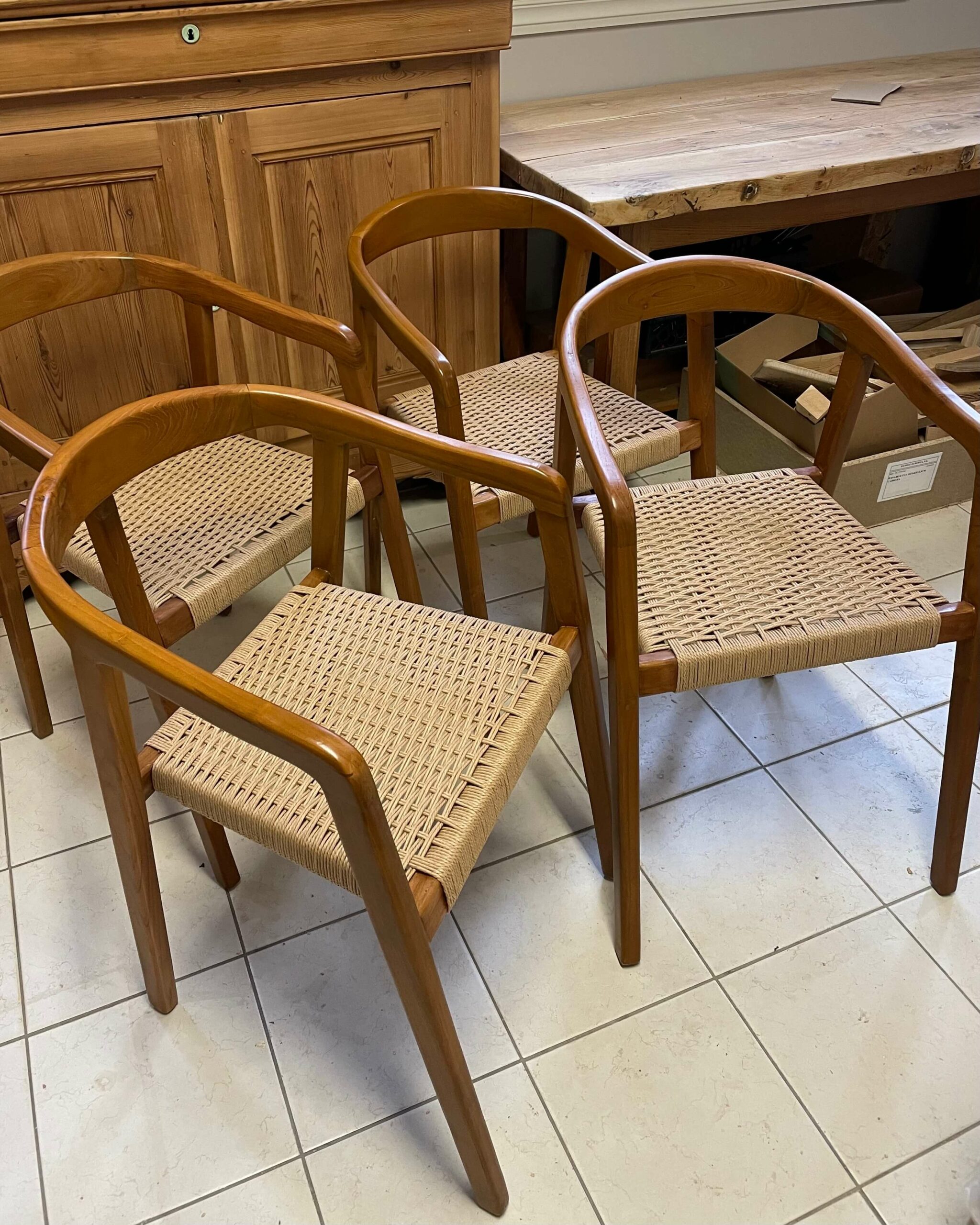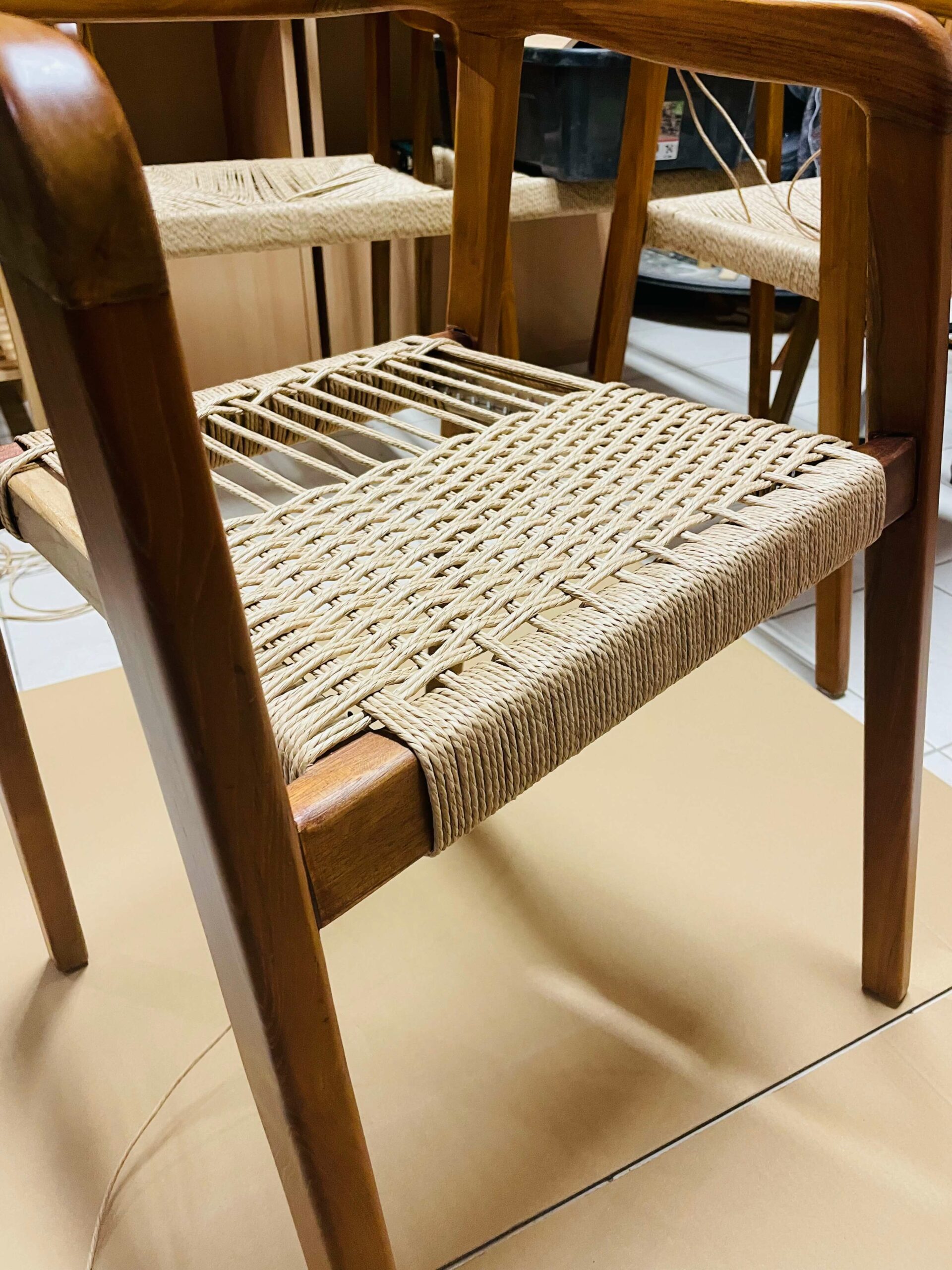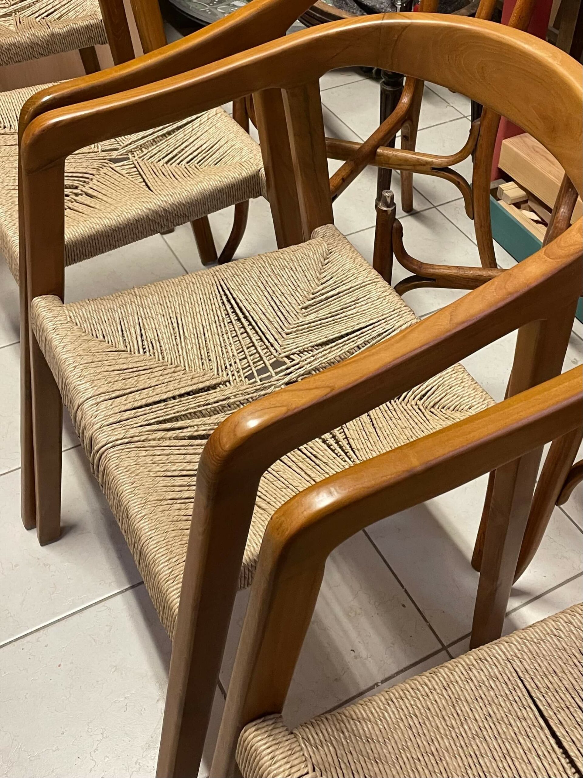 La corde danoise au service d’un bois précieux. Certains projets demandent autant de précision que de retenue. La transformation de huit fauteuils en palissandre en fait partie. Le bois était remarquable : dense, profond et vivant, mais les assises, usées par le temps, ne rendaient plus justice à la structure. L’enjeu n’était pas simplement de restaurer, il fallait transformer, sans dénaturer, grâce à une corde danoise naturelle soigneusement tissée.